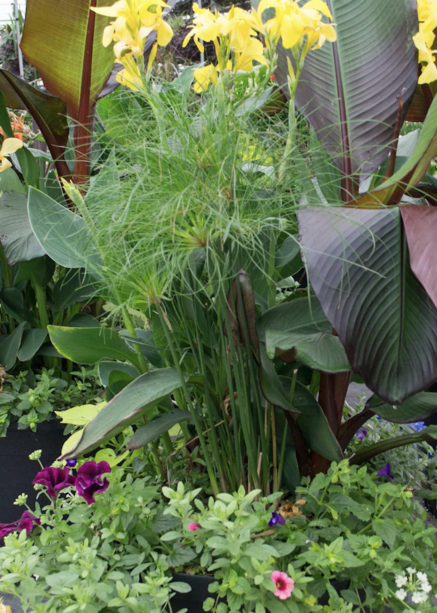 Thriller: dwarf canna lily, dwarf banana plant, and papyrus