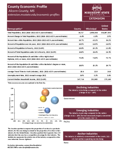 Economic Profile Alcorn County Economic Profile Download Related Files Document alcorn_county_economic_presentation.pdf (691.25 KB) Departments MSU Extension- Alcorn County