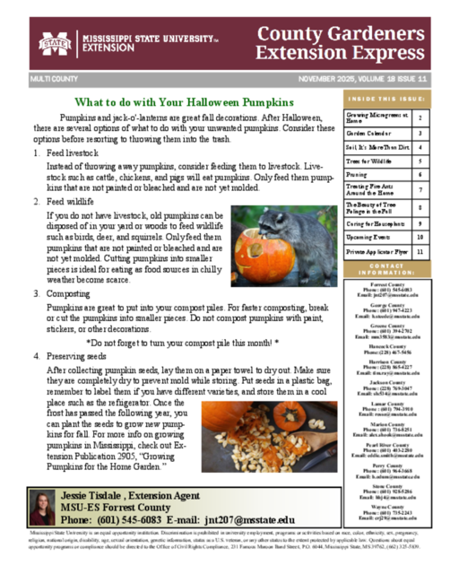 After collecting pumpkin seeds, lay them on a paper towel to dry out. Make sure they are completely dry to prevent mold while storing. Put seeds in a plastic bag, remember to label them if you have different varieties, and store them in a cool place such as the refrigerator. Once the frost has passed the following year, you can plant the seeds to grow new pump-kins for fall. For more info on growing pumpkins in Mississippi, check out Extension Publication 2905, Growing Pumpkins for the Home Garden.
