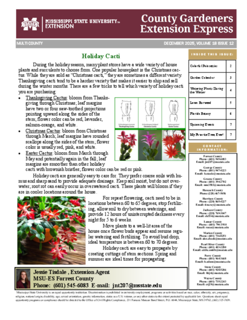 Holiday cacti are generally easy to care for. They prefer coarse soils with humus and sharp sand to provide adequate drainage. Keep soil moist, but do not overwater; root rot can easily occur in overwatered cacti. These plants will bloom if they are in cooler locations around the house.