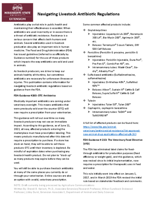 Navigating Livestock Antibiotic Regulations Download Contacts Dr. Brandi Karisch Assoc Extension/Research Prof Animal & Dairy Science brandi.karisch@msstate.edu Libby Durst Extension Associate II Animal & Dairy Science libby.durst@msstate.edu Topics Beef Beef Publications