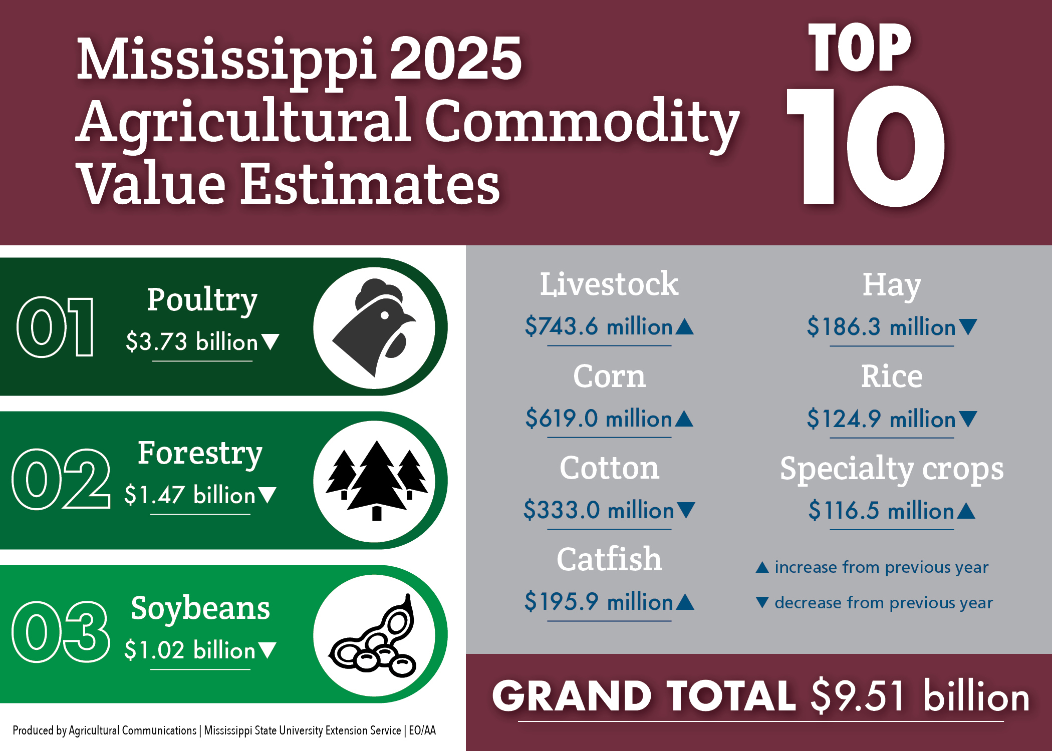 STARKVILLE, Miss. -- Despite some sharp decreases in row crop agriculture, cattle and poultry had a good year, bringing Mississippi’s 2025 estimated value of ag production to $9.51 billion.