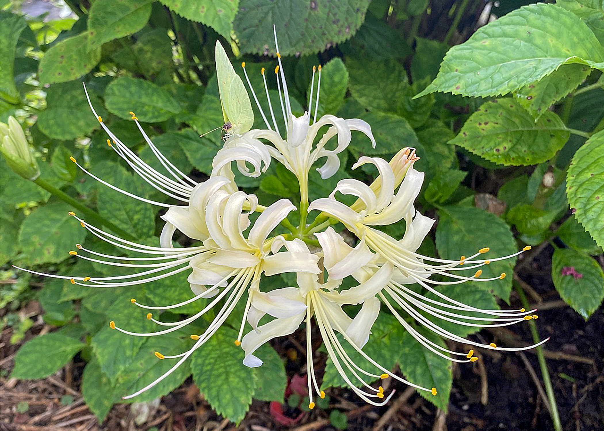 Known scientifically as Lycoris albiflora, the white lycoris in my garden creates an elegant display of crisp blooms. Each flower is lightly fragrant and laced with delicate, curling petals.