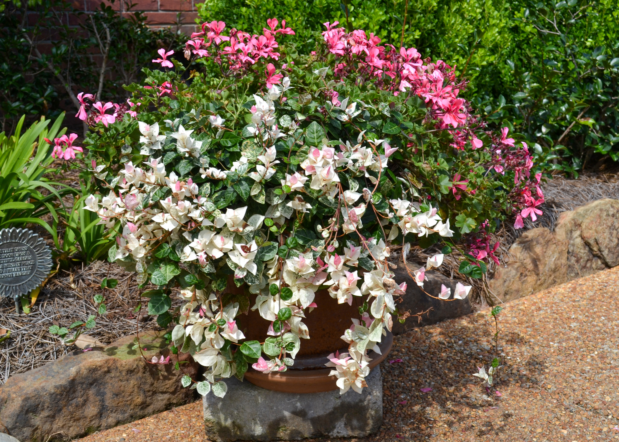 Spilled over a container’s edge, the pink, white and green leaves give the appearance of a living floral arrangement, even though it is all foliage.