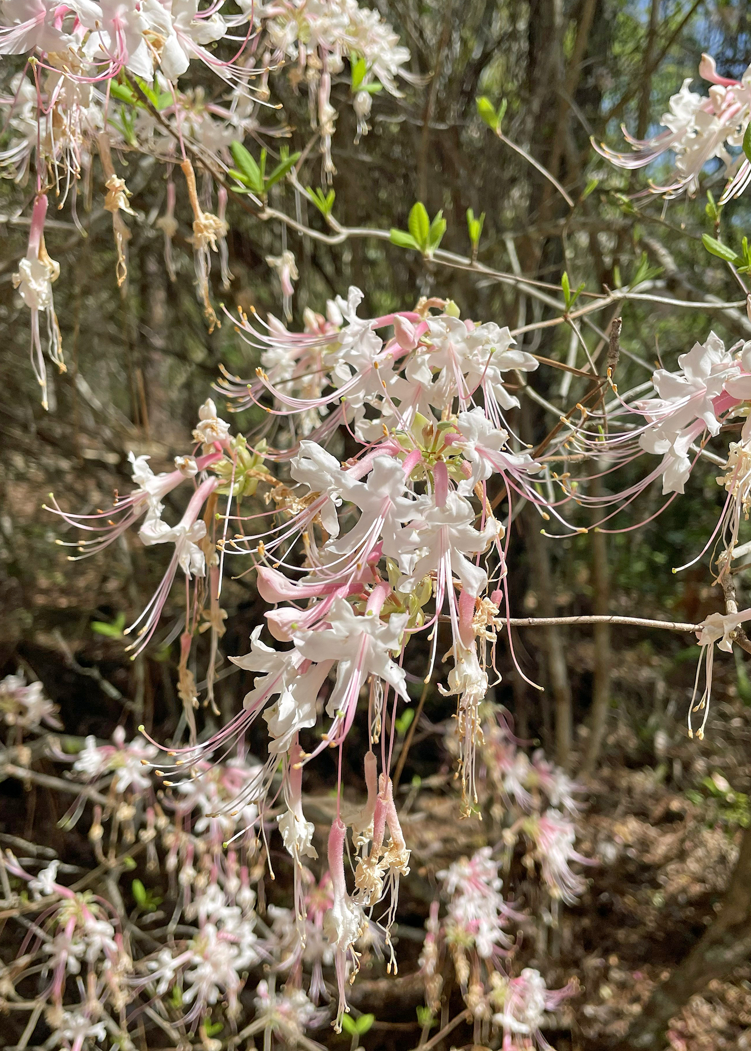 Unlike the evergreen azaleas commonly found around homes, native azaleas are deciduous, losing their leaves in winter and often blooming just as spring begins to stir. Their flowers appear on bare or lightly leafed branches, creating a soft, airy effect in natural settings.