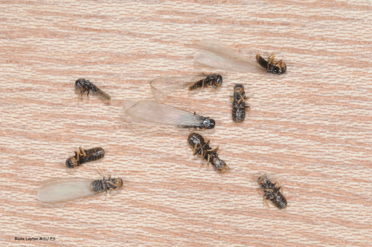 Could these be Formosan termites? Depending on where you live, Formosan termites are an equal or greater possibility, especially in the more southern parts of the state. Swarmers of the two species are easy to distinguish in good light. Eastern subterranean termite swarmers are dark-colored, like those in the photo. Formosan swarmers are tan or golden-colored, and larger. See the MSU Extension Termite Website for close-up photos of swarmers of both species (look in Section 5, Species of Termites in Mississippi). Both species are serious structural pests and need to be controlled. Fortunately, control methods are similar. Eastern subterranean termites swarm earlier in the year, from February to April, while Formosans swarm later, from May to June. See Bug’s Eye View No. 8 of 2021 for a short article on Formosan termite swarmers.