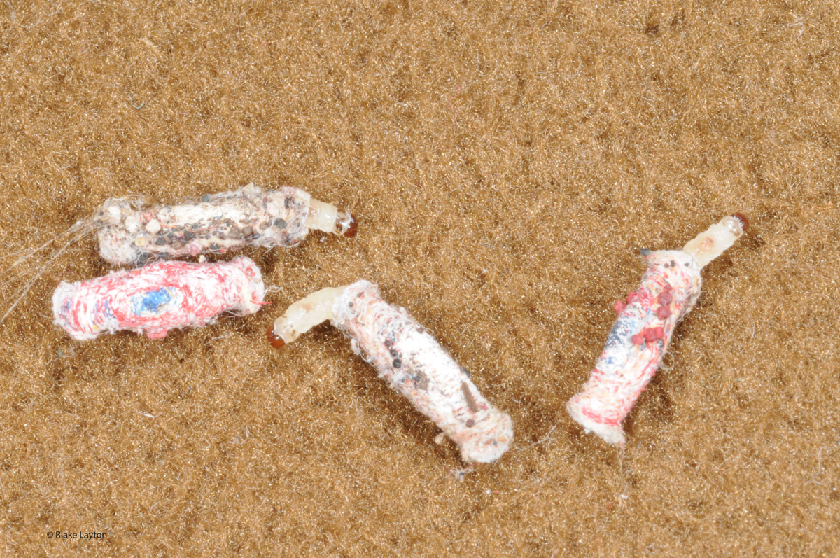 Two species of clothes moths are common in the state, case-bearing clothes moths and webbing clothes moths, Tineola bisselliella, but damage is similar. As their name implies, case-bearing clothes moth larvae form protective cases using fibers of the fabric on which they are feeding. The caterpillars, which are approximately 1/3 inch long when mature, often concentrate their feeding along seams or heavily soiled areas of fabric. In nature, clothes moths feed on hides of dead animals, accumulations of animal hair, bird nests and wasp nests, and similar items.