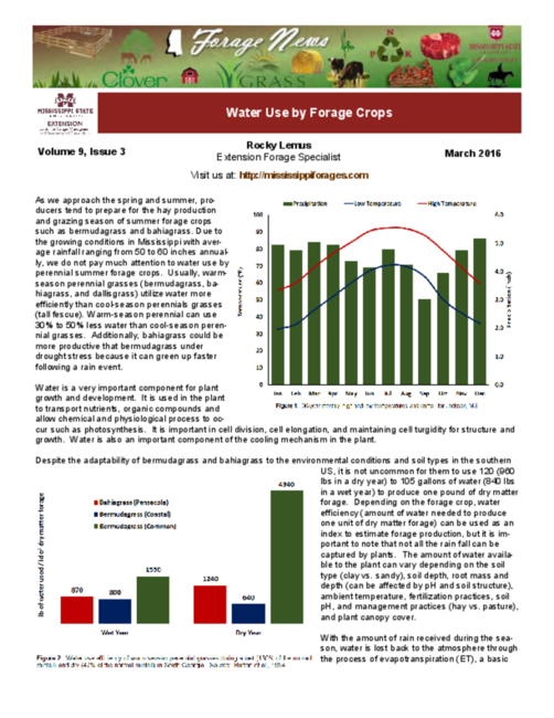 Forage News Water Use by Forage Crops Download Water Use by Forage Crops 235.58 KB Filed Under Forages Departments Plant and Soil Sciences Authors Rocky Lemus Extension/Research Professor Plant and Soil Sciences rocky.lemus@msstate.edu