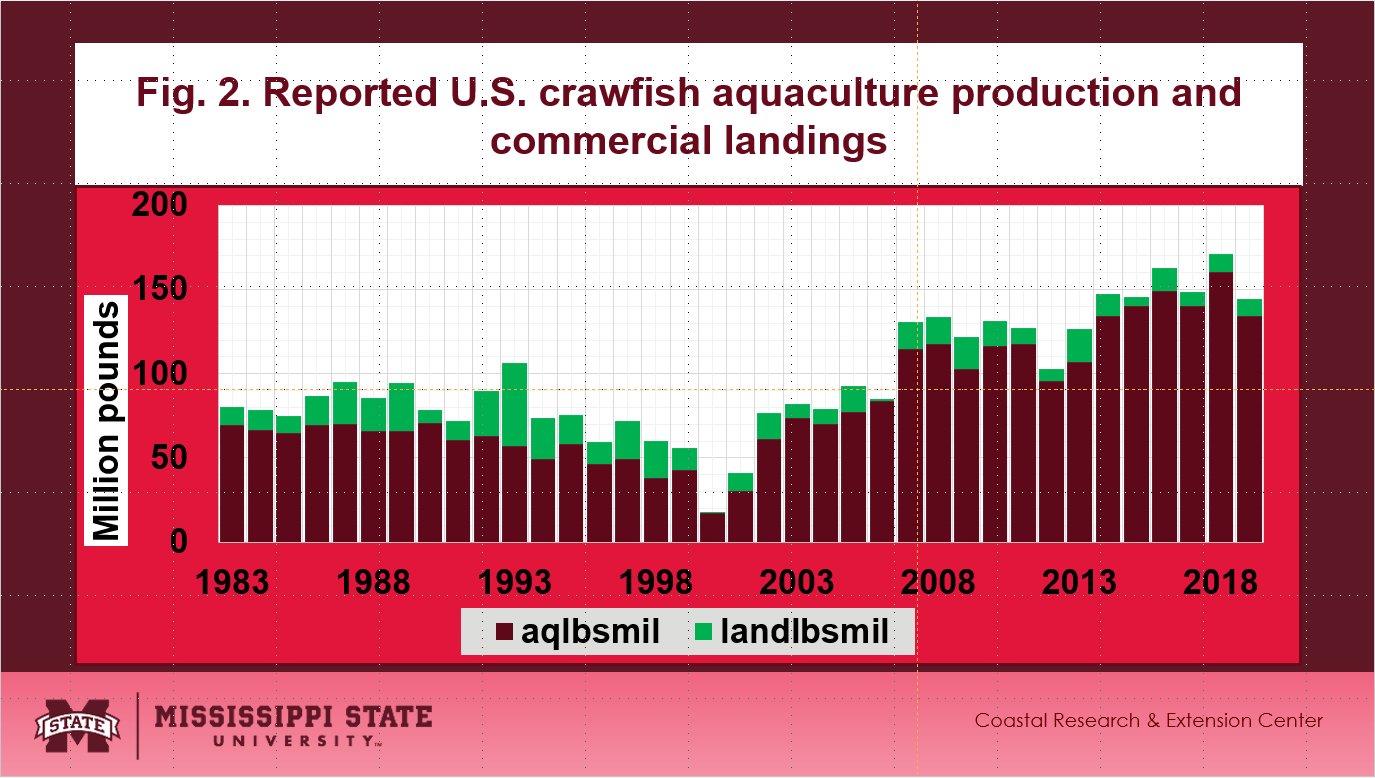 - Annual crawfish aquaculture production and commercial landings since 1983 are shown in Fig. 2.