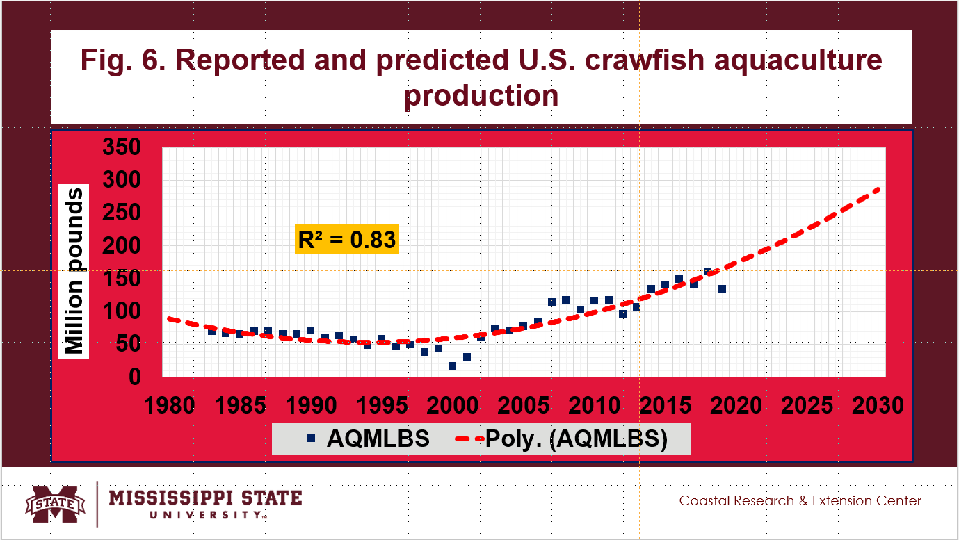 - The reported and predicted U.S. crawfish aquaculture production up to 2030 are shown in Fig. 6.