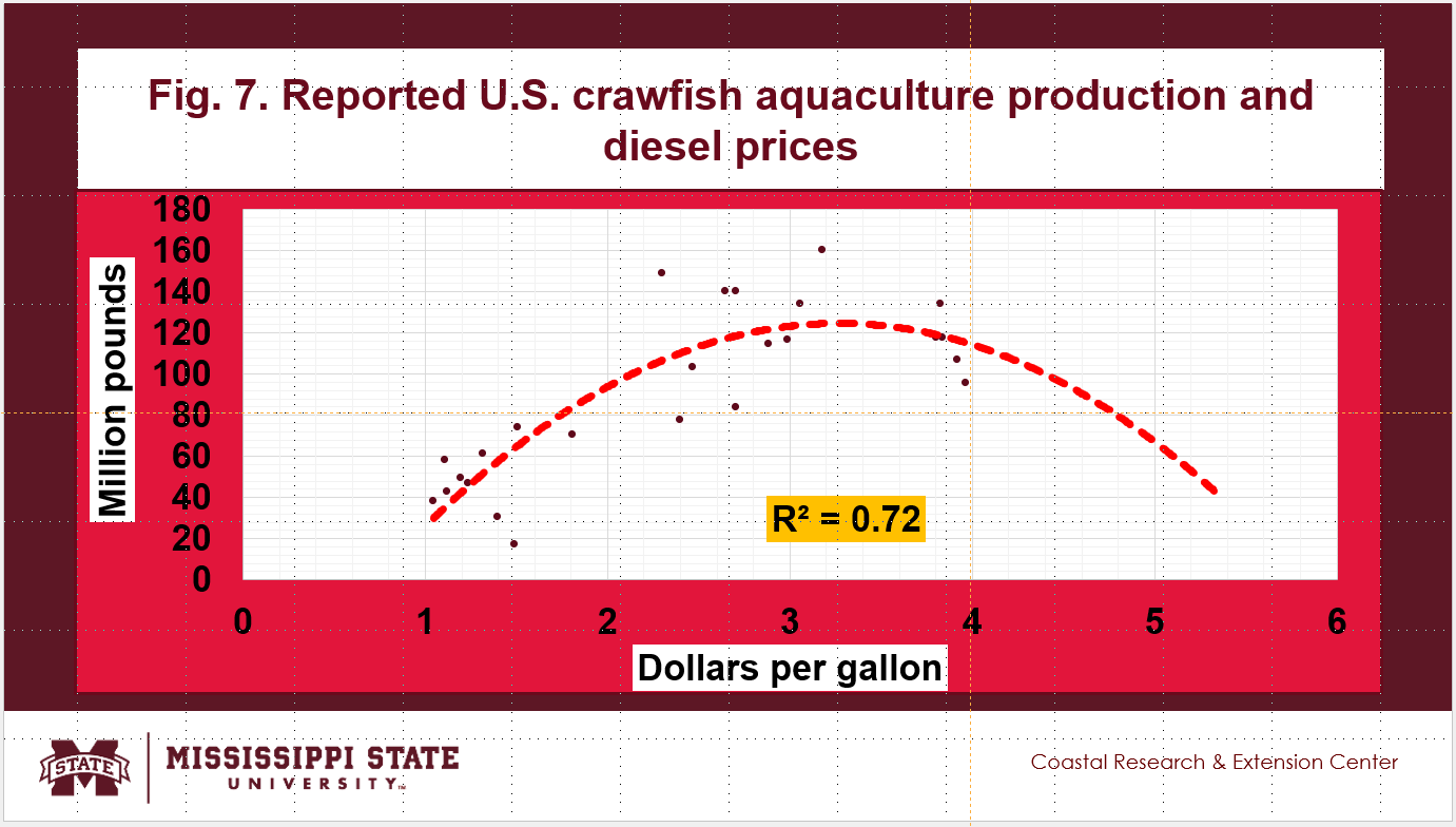 - The impacts of diesel prices on the reported crawfish aquaculture production are shown in Fig. 7. It seems that negative impacts are observed when diesel prices approached $4.00 per gallon.