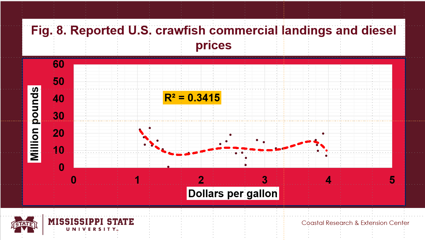 - The impacts of diesel prices on the reported commercial crawfish landings, shown in Fig. 8, are not very clear.