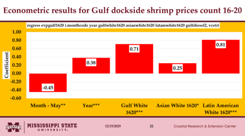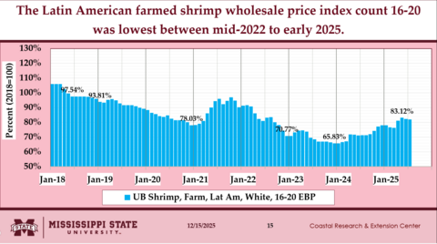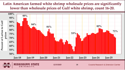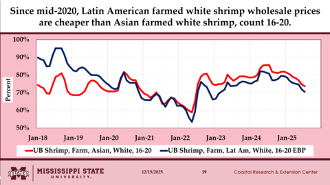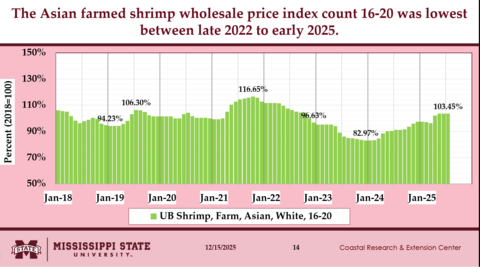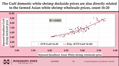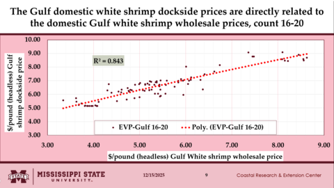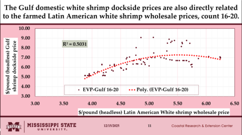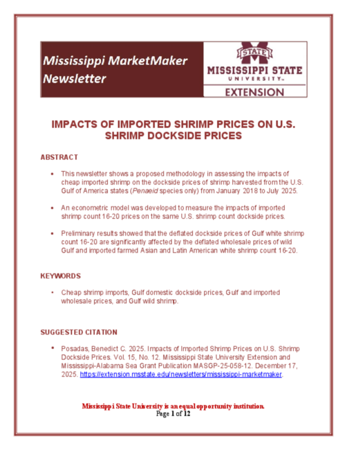 - Posadas, Benedict C. 2025. Impacts of Imported Shrimp Prices on U.S. Shrimp Dockside Prices. Vol. 15, No. 12. Mississippi State University Extension and Mississippi-Alabama Sea Grant Publication MASGP-25-058-12. December 17, 2025. https://extension.msstate.edu/newsletters/mississippi-marketmaker.