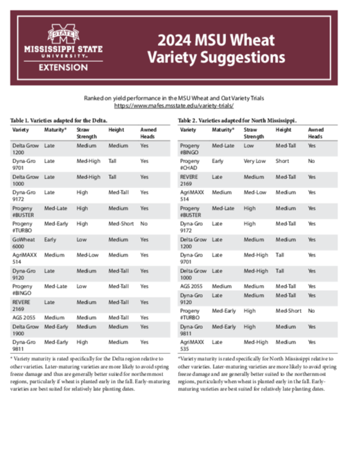 *Variety maturity is rated specifically for North Mississippi relative to other varieties. Later-maturing varieties are more likely to avoid spring freeze damage and are generally better suited to the northernmost regions, particularly when wheat is planted early in the fall. Early-maturing varieties are best suited for relatively late planting dates.