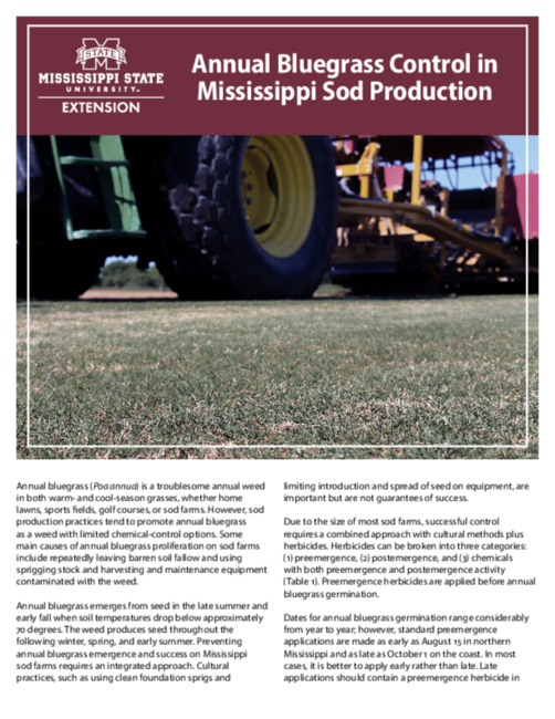 Annual bluegrass (Poa annua) is a troublesome annual weed in both warm- and cool-season grasses, whether home lawns, sports fields, golf courses, or sod farms. However, sod production practices tend to promote annual bluegrass as a weed with limited chemical-control options. Some main causes of annual bluegrass proliferation on sod farms include repeatedly leaving barren soil fallow and using sprigging stock and harvesting and maintenance equipment contaminated with the weed.