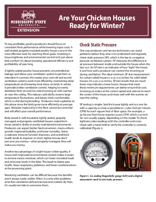Investing in sealing your poultry house isn’t just about saving on fuel; it’s about maximizing bird performance, increasing operational efficiency, and ensuring long-term sustainability for your farm. Tighten up that house; your birds and your wallet will thank you. If you need help evaluating your house’s insulation and static pressure, please contact your service rep or MSU Extension poultry specialist Jonathan Moon at jwm133@msstate.edu or (662) 325-3416.