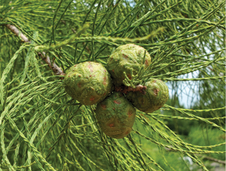 The thin, light-green leaves can appear feather-like. They are tightly and oppositely arranged along both sides of small branchlets (2 to 4 inches in length). In autumn, the trees turn copper to reddish-brown before the entire branchlet falls to the ground with some leaves still attached.
