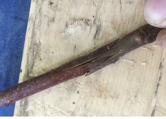 Make a 2- to 3-inch-long cut in the scion, slicing only halfway through the wood (Figure 18).