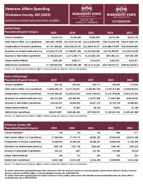 P3377-10 Chickasaw County Veterans Admin Profile Download P3377-10 Chickasaw County Veterans Admin Profile 576.96 KB Related Publications P3716-66 Smith County Census Profile (2010-2020) P3716-98 Artesia Census Profile (2010-2020) P3716-130 Byhalia Census Profile (2010-2020) P3716-162 Crowder Census Profile (2010-2020) P3716-194 Florence Census Profile (2010-2020) Departments MSU Extension- Chickasaw County Filed Under Economic Development