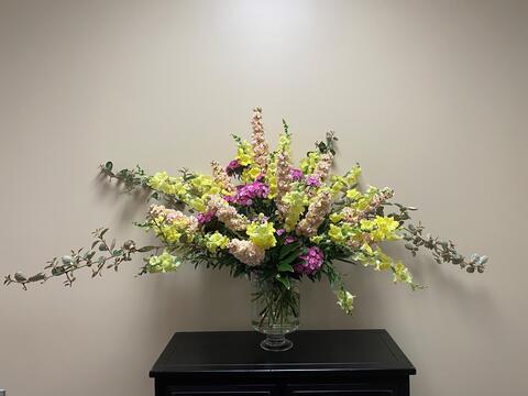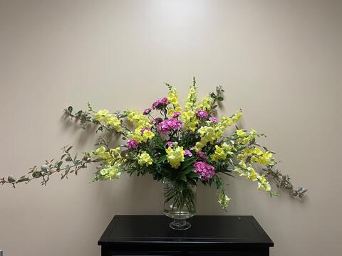 For this project, we are creating a floral arrangement suitable for a church altar or a space where the design is against a wall or mirror. All flowers and foliage used in this design were grown in Biloxi and harvested in mid-March. The cut flowers were overwintered in high tunnels.