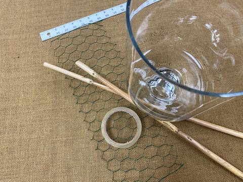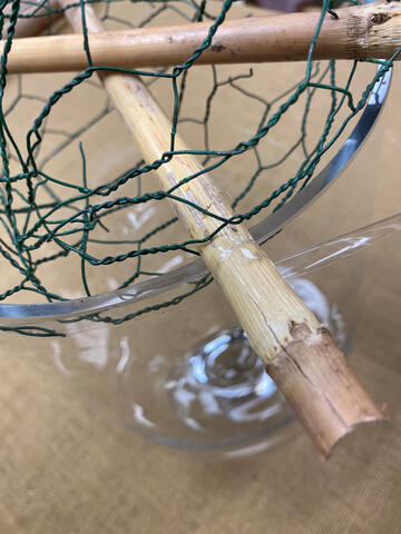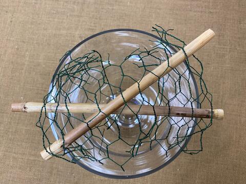 Form the chicken wire into a pillow shape, making sure that there are two distinct layers. Next, cross two river cane (or similar) stems through the wire network. Trim them so that approximately 1 inch of the stem extends beyond the container’s rim.
