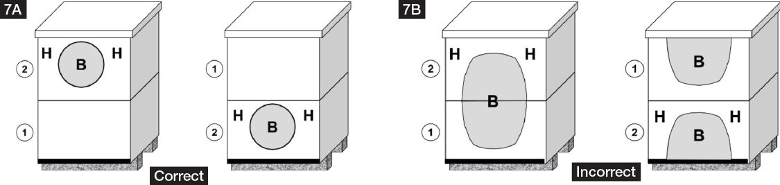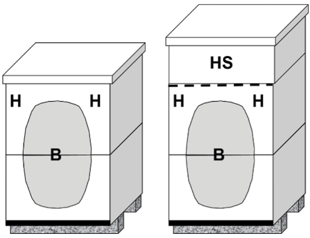 In early spring, the queen is normally locked in the uppermost hive body, which limits the size of the brood area. Swarm prevention begins in mid-March (northern Mississippi) and mid-February (southern Mississippi) with the reversal of hive bodies in the brood chamber (Figure 7A). Generally, the brood nest (B) and remaining stored honey (H) coming out of the winter cluster will be located in the top brood box (2), while the bottom brood chamber (1) will contain empty combs (or with some stored pollen) that were left after the bees had eaten stores and moved the cluster upward during the winter.