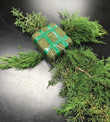 Remember, floral foam is a non-decorative mechanic; therefore, it must be completely covered. If you place your greenery properly—beginning toward the back of the brick and working forward—the design will not have an unbalanced look or appear to be falling forward.