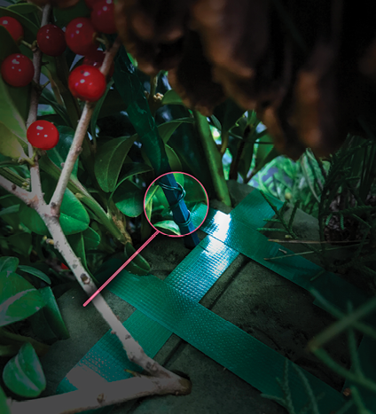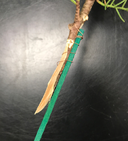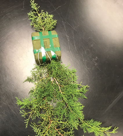 Secure long evergreen stems to a wired wood pick to keep them from falling out of the foam, especially those that hang downward in the design. Notice how the wire is attached. The first revolution goes around the fresh stem only. Successive revolutions spiral around the stem and the pick until the wire ends.