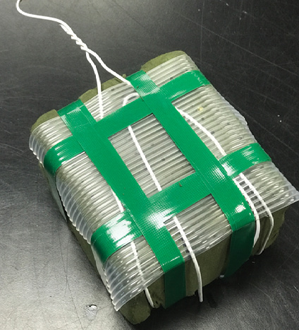 Step 4. Wrap the foam/wire/plastic backing unit with waterproof tape. Start around the outside of the brick and wrap firmly, without damaging the fragile foam, around the entire brick twice, creating two layers of thickness.