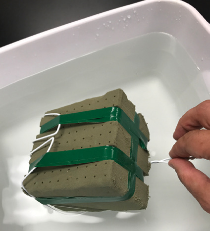 Step 5. Once you are ready to make the design, it is time to hydrate the fresh floral foam. Immerse the entire cage by merely dropping it on the surface of the water. Do not force fresh floral foam below the water line. This action may create a “dry core” where water has not penetrated the center portion of the brick. Merely place the foam unit on the surface of the water. The “free float” method is quick, taking only about 30 seconds for the brick to be fully hydrated and ready for use.