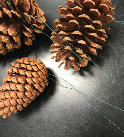 Step 6. Using precut lengths, wrap and twist florist wire through the cones’ scales. Make the twist at the halfway point of the wire so that the arms of the wire are approximately the same length. Wire these to the wooden picks. You can add some of the waterproof tape over the wire to secure it in place.