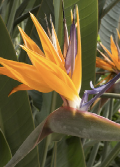 Brightly contrasting orange and blue flowers bloom on mature plants. Several complete flower segments are hidden within the green bract. They can be displayed all at once by gently reflexing the bract and carefully fanning the florets outward.