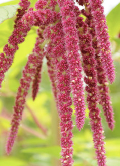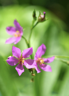 Wiry, wispy stems bear small flowers. The pinkish, bead-like seed pods are showier than the flowers.