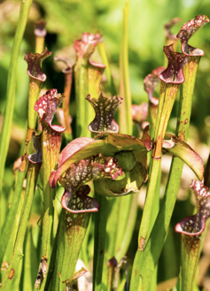 The funnel-shaped leaves of this plant are spectacular. Pitcher plant enjoys moist soil. Cultivate this plant rather than harvesting it from the wild as its habitat is greatly depleted.
