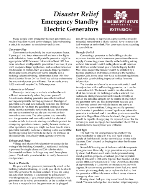 Generator size is probably the most important factor. If your goal is to keep a freezer cold and run a few lights and a television, then a small portable generator might be appropriate. MSU Extension Information Sheet 1921 has more details on small portable generators. However, if you want to operate larger appliances, such as whole-house air conditioners or heaters, then you need a larger generator. These generators are generally wired directly into a building’s electrical wiring. Information Sheet 1954 How Much Electrical Power Do You Need? has advice to determine the amount of power you will need. For example, every 1,000 watts will require 2 to 2¼ horsepower.
