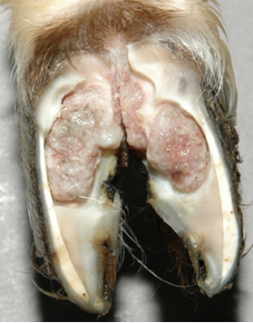 Problem Symptoms Diagnosis Foot Rot Fever, loss of appetite, hoof deformity. Severe odor, pus, erosion of tissue between the sole, the toe, and the wall horn. Foot Scald Lameness, reduced weight gain, grazing on front knees. Skin between toes appears pink to white, moist, raw, and sensitive to the touch, and has a bad odor.