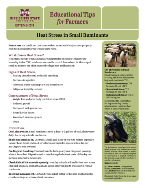 Heat stress occurs when animals are subjected to excessive temperature-humidity index (THI) levels and are unable to cool themselves. In Mississippi, small ruminants are often exposed to high heat and humidity.