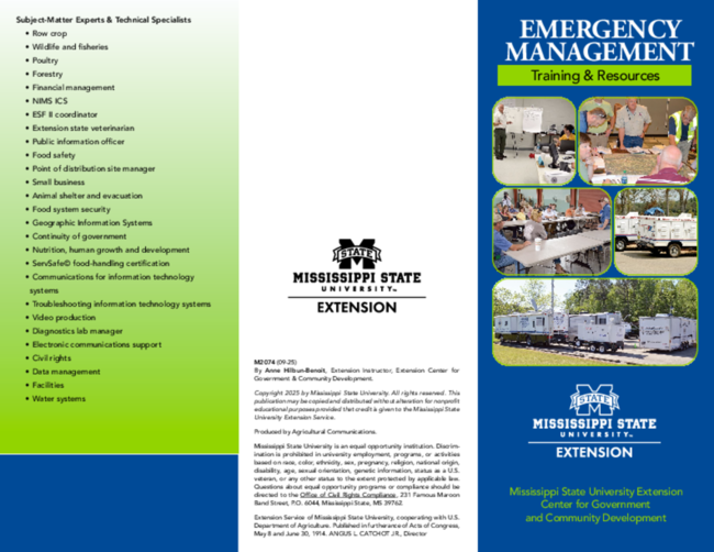 The Mississippi State University Extension Center for Government and Community Development provides a wide variety of training opportunities for emergency managers, local government officials, nongovernmental groups, and citizens as requested.