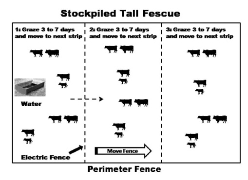 To use stockpiled forage efficiently, you must manage grazing. Uncontrolled grazing may waste about 50 to 60 percent of the forage because of trampling and manure dropping on unused forage. The best way to use stockpiled tall fescue is by strip-grazing. Restrict access to a 3- or 7-day forage supply to increase the number of grazing days. To make the most efficient use of the high-quality feed in stockpiled fields, install a temporary electric fence across the field dividing it so the area to be grazed first has a source of water and minerals. Once the animals have grazed this area off, move the fence back, opening up a new strip. Repeat this system until the entire field has been grazed (Figure 4).