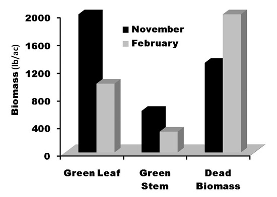 Stockpiled tall fescue loses about 25 to 30 percent of its dry matter over winter. The rate of dry matter loss does not depend on nitrogen rate or stockpile start date. Stockpiled tall fescue does not usually lose much quality; most losses are because of dry matter deterioration. The nutrition value may be able to support good livestock growth rates in developing cattle. Tall fescue loses soluble carbohydrates and potassium (K) because of absorption by the root system and leaf deterioration. The loss in carbohydrates can cause the forage to have more fiber and be less digestible. Green leaf and green stem decrease by about half from November to February. During the same time, biomass increases by about half (Figure 5). These changes are not directly related to the endophyte status or how long the tall fescue has been stockpiled.
