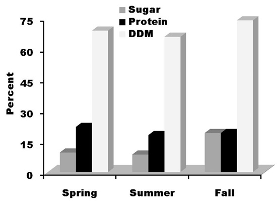Sugar content, protein, and digestibility could be acceptable from autumn to early winter (Figure 6). Crude protein concentrations tend to decrease in winter. Concentrations of NDF do not change because of the duration of stockpiling. IVDMD decreases from mid-December to mid-February.