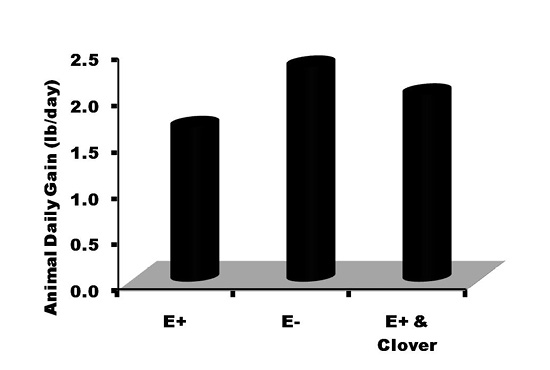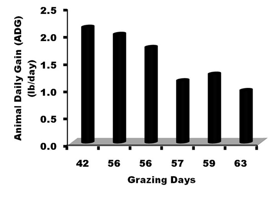 Fall-calving cows can benefit from stockpiled fescue. Animal average daily gain (ADG) in calves could be affected by the number of days in the grazing period. ADG may decrease as grazing period length increases (Figure 7). Endophyte status could also affect animal average daily gains (Figure 8). The highest gains on stockpiled fescue are from endophyte-infected grass. The presence of a legume such as red clover with stockpiled fescue will also increase animal gains.