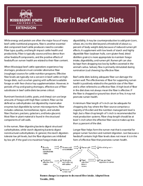 While energy and protein are often the major focus of many beef cattle nutritional programs, fiber is another essential diet component beef cattle producers need to consider. Fiber type, quality, and length impact cattle health and productivity. Fiber is typically coarse and less dense than other feedstuff components, and the positive effects of feedstuffs on rumen health are related to their fiber content. When Mississippi beef cattle operations experience hay shortages, producers must consider alternative fiber (roughage) sources for cattle nutrition programs. Effective fiber levels are typically not a concern in beef cattle on high-forage diets, such as when grazing with sufficient available forage or with free-choice hay supplementation. However, in periods of hay and grazing shortages, effective use of fiber substitutes in beef cattle diets becomes critical.