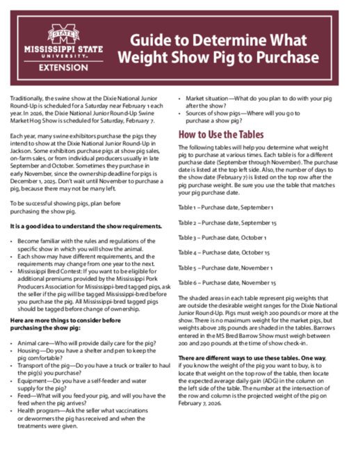 Each year, many swine exhibitors purchase the pigs they intend to show at the Dixie National Junior Round-Up in Jackson. Some exhibitors purchase pigs at show pig sales, on-farm sales, or from individual producers usually in late September and October. Sometimes they purchase in early November, since the ownership deadline for pigs is December 1, 2025. Don’t wait until November to purchase a pig, because there may not be many left.