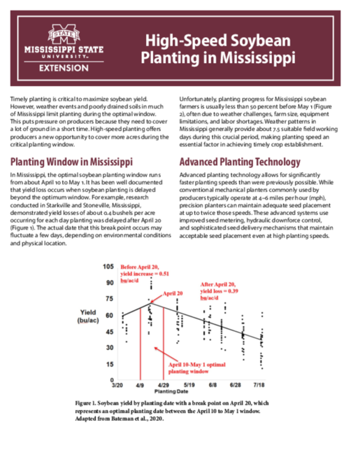 Timely planting is critical to maximize soybean yield. However, weather events and poorly drained soils in much of Mississippi limit planting during the optimal window. This puts pressure on producers because they need to cover a lot of ground in a short time. High-speed planting offers producers a new opportunity to cover more acres during the critical planting window.