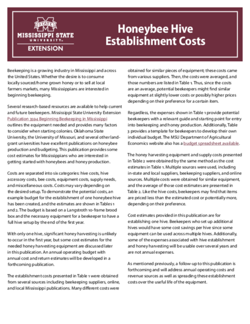 Several research-based resources are available to help current and future beekeepers. Mississippi State University Extension Publication 3594 Beginning Beekeeping in Mississippi outlines the equipment needed and provides many factors to consider when starting colonies. Oklahoma State University, the University of Missouri, and several other land-grant universities have excellent publications on honeybee production and budgeting. This publication provides some cost estimates for Mississippians who are interested in getting started with honeybees and honey production.