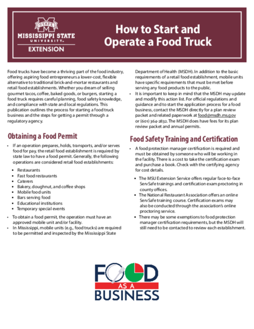 Food trucks have become a thriving part of the food industry, offering aspiring food entrepreneurs a lower-cost, flexible alternative to traditional brick-and-mortar restaurants and retail food establishments. Whether you dream of selling gourmet tacos, coffee, baked goods, or burgers, starting a food truck requires careful planning, food safety knowledge, and compliance with state and local regulations. This publication outlines the process for starting a food truck business and the steps for getting a permit through a regulatory agency.