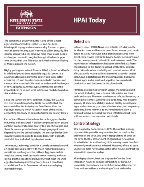 Backyard flock owners should not panic over a single bird death, but sudden illness or multiple deaths are red flags. If you suspect HPAI, report it immediately. Backyard growers should visit the Mississippi Board of Animal Health website and select report dead birds or call 1-888-646-8731. Commercial producers should contact their field service representative. When handling suspected infected birds, always wear full protective gear, including goggles, a mask, gloves, and coveralls, and follow proper sanitation guidelines.