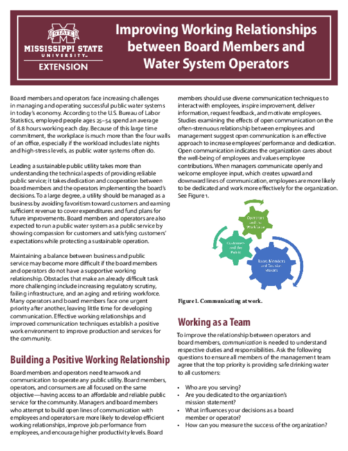 As the demands on public water systems continue to rise, it is critical that board members and operators focus not only on what decisions are made but also how decisions are reached. Open communication, clear expectations, and a shared vision are required to maintain a successful water system. An honest assessment of the relationships within the system, done with the goal of improving the water system, can be an invaluable use of board members’ and operators’ time. Creating and maintaining strong relationships between board members and operators can pay off in more ways than just good business. When operators and board members improve their working relationships, water systems thrive, board members become engaged, and the community as a whole benefits.