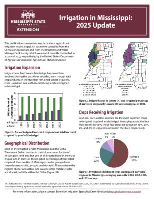 This publication summarizes key facts about agricultural irrigation in Mississippi. All data were compiled from the Census of Agriculture and from the Irrigation and Water Management Survey, which were most recently conducted in 2022 and 2023, respectively, by the United States Department of Agriculture’s National Agricultural Statistics Service.